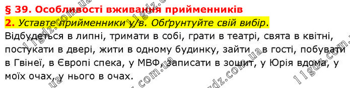 § 39. Особливості вживання прийменників 2. Уставте прийменники у/в. Обґрунтуйте свій вибір. Відбудеться в липні, тримати в собі, грати в театрі, свята в квітні, постукати в двері, жити в одному будинку, зайти в гості, побувати в Гвінеї, в Європі спека, у МВФ, записати в зошит, у Юрія вдома, у моїх очах, у нього в очах.