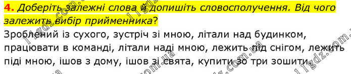 4. Доберіть залежні слова й допишіть словосполучення. Від чого залежить вибір прийменника? Зроблений із сухого, зустріч зі мною, літали над будинком, працювати в команді, літали наді мною, лежить під снігом, лежить піді мною, ішов з дому, ішов зі свята, купити зо три зошити.