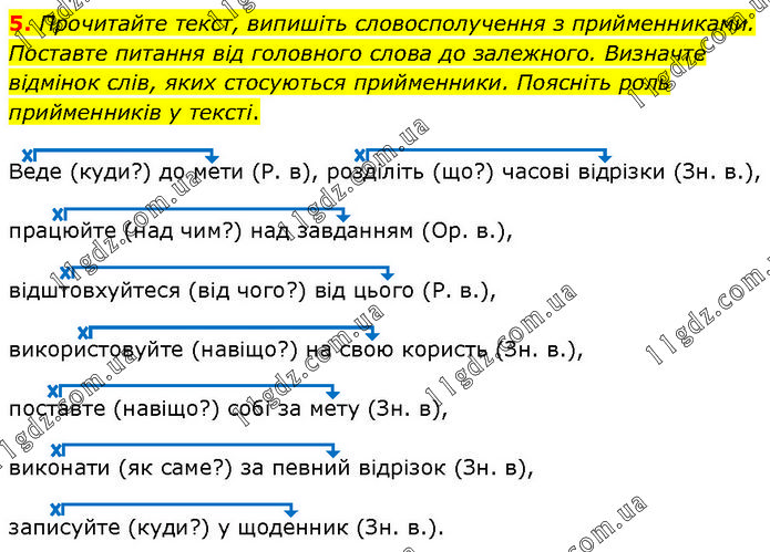 Прочитайте текст, випишіть словосполучення з прийменниками. Поставте питання від головного слова до залежного. Визначте відмінок слів, яких стосуються прийменники. Поясніть роль прийменників у тексті. Веде (куди?) до мети (Р. в), розділіть (що?) часові відрізки (Зн. в.), працюйте (над чим?) над завданням (Ор. в.), відштовхуйтеся (від чого?) від цього (Р. в.), використовуйте (навіщо?) на свою користь (Зн. в.), поставте (навіщо?) собі за мету (Зн. в), виконати (як саме?) за певний відрізок (Зн. в), записуйте (куди?) у щоденник (Зн. в.).