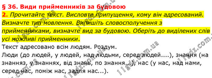 § 36. Види прийменників за будовою 2. Прочитайте текст. Висловте припущення, кому він адресований. Визначте тип мовлення. Випишіть словосполучення з прийменниками, визначте вид за будовою. Оберіть до виділених слів усі можливі прийменники. Текст адресовано всім людям. Роздум. Люди (до людей, у людей, над людьми, серед людей....), знання (на знанняз, у знаннях, від знань, по знання...), нас (у нас, над нами, серед нас, поміж нас, задля нас...).