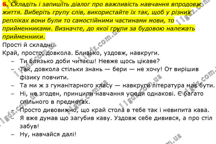 6. Складіть і запишіть діалог про важливість навчання впродовж життя. Виберіть групу слів, використайте їх так, щоб у різних репліках вони були то самостійними частинами мови, то прийменниками. Визначте, до якої групи за будовою належать прийменники. Прості й складні. Край, просто, довкола. Близько, уздовж, навкруги. – Ти близько доби читаєш! Невже щось цікаве? – Так, довкола стільки знань — бери — не хочу! От вирішив фізику повчити. – Та ми ж з гуманітарного класу — навкруги література має бути. – Ні, не згоден, принципи навчання усюди однакові. Є багато спільного в предметах. – Просто дивовижно, що край стола в тебе так і невипита кава. – Я вже думав що загубив каву. Уздовж себе дивився, а про стіл забув! – Ну, навчайся далі!