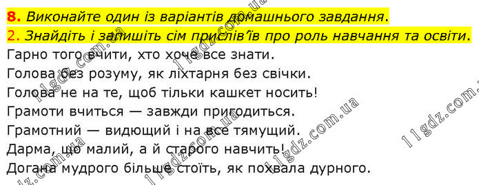 Виконайте один із варіантів домашнього завдання. 2. Знайдіть і запишіть сім прислів’їв про роль навчання та освіти. Гарно того вчити, хто хоче все знати. Голова без розуму, як ліхтарня без свічки. Голова не на те, щоб тільки кашкет носить! Грамоти вчиться — завжди пригодиться. Грамотний — видющий і на все тямущий. Дарма, що малий, а й старого навчить! Догана мудрого більше стоїть, як похвала дурного.