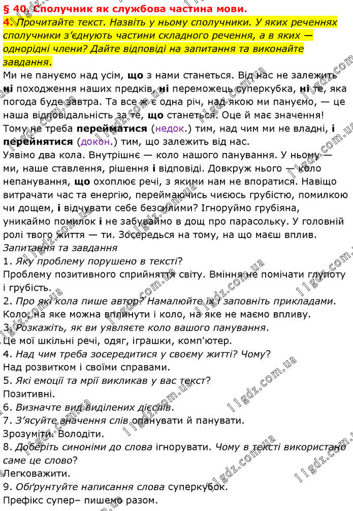 § 40. Сполучник як службова частина мови. 4. Прочитайте текст. Назвіть у ньому сполучники. У яких реченнях сполучники з’єднують частини складного речення, а в яких — однорідні члени? Дайте відповіді на запитання та виконайте завдання. Ми не пануємо над усім, що з нами станеться. Від нас не залежить ні походження наших предків, ні переможець суперкубка, ні те, яка погода буде завтра. Та все ж є одна річ, над якою ми пануємо, — це наша відповідальність за те, що станеться. Оце й має значення! Тому не треба перейматися (недок.) тим, над чим ми не владні, і перейнятися (докон.) тим, що залежить від нас. Уявімо два кола. Внутрішнє — коло нашого панування. У ньому — ми, наше ставлення, рішення і відповіді. Довкруж нього — коло непанування, що охоплює речі, з якими нам не впоратися. Навіщо витрачати час та енергію, переймаючись чиєюсь грубістю, помилкою чи дощем, і відчувати себе безсилими? Ігноруймо грубіяна, уникаймо помилок і не забуваймо в дощ про парасольку. У головній ролі твого життя — ти. Зосередься на тому, на що маєш вплив. Запитання та завдання 1. Яку проблему порушено в тексті? Проблему позитивного сприйняття світу. Вміння не помічати глупоту і грубість. 2. Про які кола пише автор? Намалюйте їх і заповніть прикладами. Коло, на яке можна вплинути і коло, на яке не маємо впливу. 3. Розкажіть, як ви уявляєте коло вашого панування. Це мої шкільні речі, одяг, іграшки, комп'ютер. 4. Над чим треба зосередитися у своєму житті? Чому? Над розвитком і своїми справами. 5. Які емоції та мрії викликав у вас текст? Позитивні. 6. Визначте вид виділених дієслів. 7. З’ясуйте значення слів опанувати й панувати. Зрозуміти. Володіти. 8. Доберіть синоніми до слова ігнорувати. Чому в тексті використано саме це слово? Легковажити. 9. Обґрунтуйте написання слова суперкубок. Префікс супер– пишемо разом.