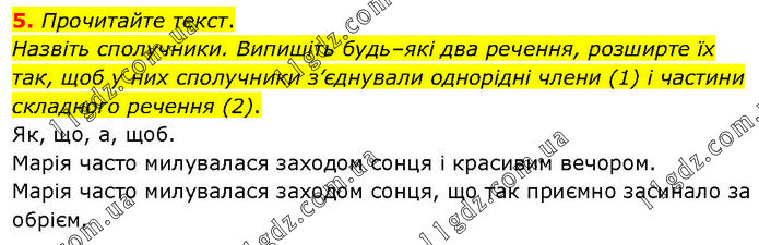 Прочитайте текст. Назвіть сполучники. Випишіть будь–які два речення, розширте їх так, щоб у них сполучники з’єднували однорідні члени (1) і частини складного речення (2). Як, що, а, щоб. Марія часто милувалася заходом сонця і красивим вечором. Марія часто милувалася заходом сонця, що так приємно засинало за обрієм.
