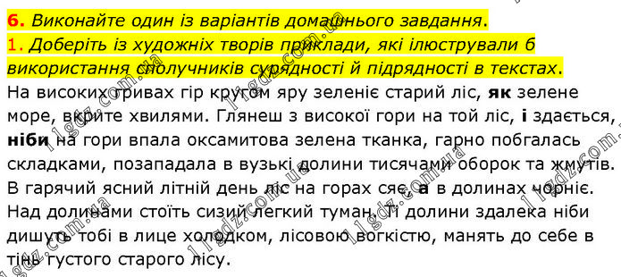 Виконайте один із варіантів домашнього завдання. 1. Доберіть із художніх творів приклади, які ілюстрували б використання сполучників сурядності й підрядності в текстах. На високих гривах гір кругом яру зеленіє старий ліс, як зелене море, вкрите хвилями. Глянеш з високої гори на той ліс, і здається, ніби на гори впала оксамитова зелена тканка, гарно побгалась складками, позападала в вузькі долини тисячами оборок та жмутів. В гарячий ясний літній день ліс на горах сяє, а в долинах чорніє. Над долинами стоїть сизий легкий туман. Ті долини здалека ніби дишуть тобі в лице холодком, лісовою вогкістю, манять до себе в тінь густого старого лісу.