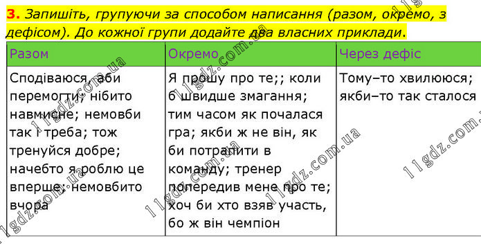 Запишіть, групуючи за способом написання (разом, окремо, з дефісом). До кожної групи додайте два власних приклади. Разом Окремо Через дефіс Сподіваюся, аби перемогти; нібито навмисне; немовби так і треба; тож тренуйся добре; начебто я роблю це вперше; немовбито вчора Я прошу про те;; коли б швидше змагання; тим часом як почалася гра; якби ж не він, як би потрапити в команду; тренер попередив мене про те; хоч би хто взяв участь, бо ж він чемпіон Тому–то хвилююся; якби–то так сталося