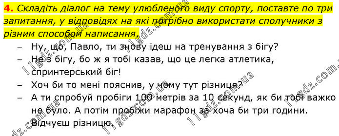 Складіть діалог на тему улюбленого виду спорту, поставте по три запитання, у відповідях на які потрібно використати сполучники з різним способом написання. – Ну, що, Павло, ти знову ідеш на тренування з бігу? – Не з бігу, бо ж я тобі казав, що це легка атлетика, спринтерський біг! – Хоч би то мені пояснив, у чому тут різниця? – А ти спробуй пробіги 100 метрів за 10 секунд, як би тобі важко не було. А потім пробіжи марафон за хоча би три години. Відчуєш різницю.