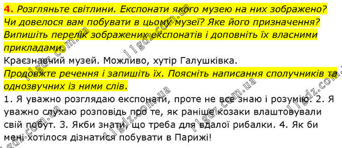4. Розгляньте світлини. Експонати якого музею на них зображено? Чи довелося вам побувати в цьому музеї? Яке його призначення? Випишіть перелік зображених експонатів і доповніть їх власними прикладами. Краєзнавчий музей. Можливо, хутір Галушківка. Продовжте речення і запишіть їх. Поясніть написання сполучників та однозвучних із ними слів. 1. Я уважно розглядаю експонати, проте не все знаю і розумію. 2. Я уважно слухаю розповідь про те, як раніше козаки влаштовували свій побут. 3. Якби знати, що треба для вдалої рибалки. 4. Як би мені хотілося дізнатися побувати в Парижі!