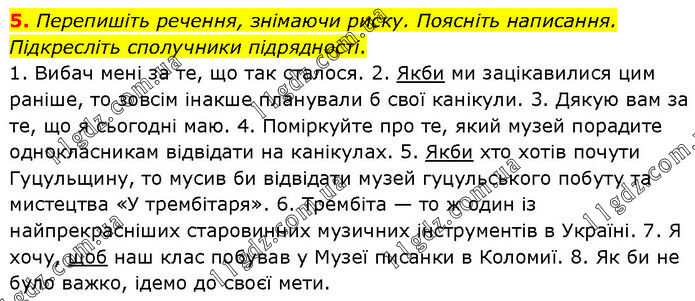 5. Перепишіть речення, знімаючи риску. Поясніть написання. Підкресліть сполучники підрядності. 1. Вибач мені за те, що так сталося. 2. Якби ми зацікавилися цим раніше, то зовсім інакше планували б свої канікули. 3. Дякую вам за те, що я сьогодні маю. 4. Поміркуйте про те, який музей порадите однокласникам відвідати на канікулах. 5. Якби хто хотів почути Гуцульщину, то мусив би відвідати музей гуцульського побуту та мистецтва «У трембітаря». 6. Трембіта — то ж один із найпрекрасніших старовинних музичних інструментів в Україні. 7. Я хочу, щоб наш клас побував у Музеї писанки в Коломиї. 8. Як би не було важко, ідемо до своєї мети.