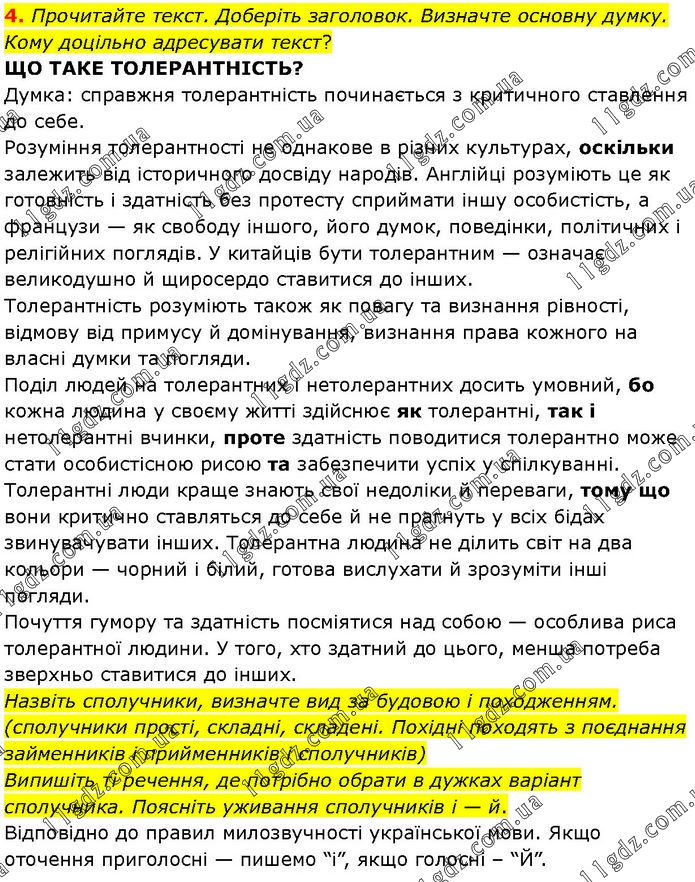 Прочитайте текст. Доберіть заголовок. Визначте основну думку. Кому доцільно адресувати текст? ЩО ТАКЕ ТОЛЕРАНТНІСТЬ? Думка: справжня толерантність починається з критичного ставлення до себе. Розуміння толерантності не однакове в різних культурах, оскільки залежить від історичного досвіду народів. Англійці розуміють це як готовність і здатність без протесту сприймати іншу особистість, а французи — як свободу іншого, його думок, поведінки, політичних і релігійних поглядів. У китайців бути толерантним — означає великодушно й щиросердо ставитися до інших. Толерантність розуміють також як повагу та визнання рівності, відмову від примусу й домінування, визнання права кожного на власні думки та погляди. Поділ людей на толерантних і нетолерантних досить умовний, бо кожна людина у своєму житті здійснює як толерантні, так і нетолерантні вчинки, проте здатність поводитися толерантно може стати особистісною рисою та забезпечити успіх у спілкуванні. Толерантні люди краще знають свої недоліки й переваги, тому що вони критично ставляться до себе й не прагнуть у всіх бідах звинувачувати інших. Толерантна людина не ділить світ на два кольори — чорний і білий, готова вислухати й зрозуміти інші погляди. Почуття гумору та здатність посміятися над собою — особлива риса толерантної людини. У того, хто здатний до цього, менша потреба зверхньо ставитися до інших. Назвіть сполучники, визначте вид за будовою і походженням. (сполучники прості, складні, складені. Похідні походять з поєднання займенників і прийменників і сполучників) Випишіть ті речення, де потрібно обрати в дужках варіант сполучника. Поясніть уживання сполучників і — й. Відповідно до правил милозвучності української мови. Якщо оточення приголосні — пишемо “і”, якщо голосні – “Й”.