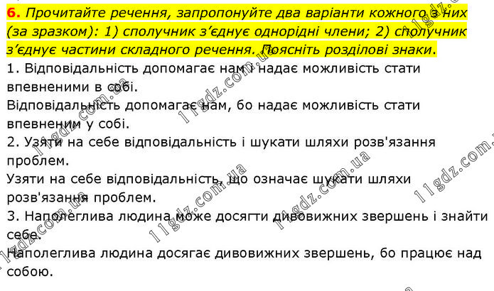 Прочитайте речення, запропонуйте два варіанти кожного з них (за зразком): 1) сполучник з’єднує однорідні члени; 2) сполучник з’єднує частини складного речення. Поясніть розділові знаки. 1. Відповідальність допомагає нам і надає можливість стати впевненими в собі. Відповідальність допомагає нам, бо надає можливість стати впевненим у собі. 2. Узяти на себе відповідальність і шукати шляхи розв'язання проблем. Узяти на себе відповідальність, що означає шукати шляхи розв'язання проблем. 3. Наполеглива людина може досягти дивовижних звершень і знайти себе. Наполеглива людина досягає дивовижних звершень, бо працює над собою.