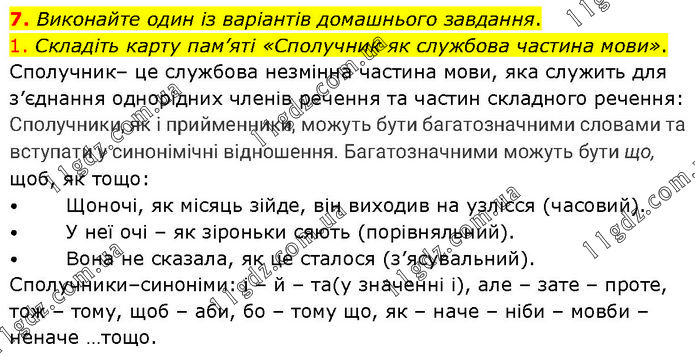 Виконайте один із варіантів домашнього завдання. 1. Складіть карту пам’яті «Сполучник як службова частина мови». Сполучник– це службова незмінна частина мови, яка служить для з’єднання однорідних членів речення та частин складного речення: Сполучники, як і прийменники, можуть бути багатозначними словами та вступати у синонімічні відношення. Багатозначними можуть бути що, щоб, як тощо: • Щоночі, як місяць зійде, він виходив на узлісся (часовий). • У неї очі – як зіроньки сяють (порівняльний). • Вона не сказала, як це сталося (з’ясувальний). Сполучники–синоніми: і – й – та(у значенні і), але – зате – проте, тож – тому, щоб – аби, бо – тому що, як – наче – ніби – мовби – неначе …тощо.