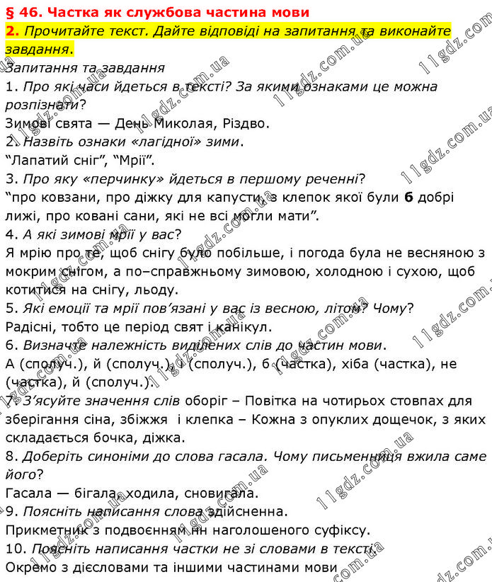 § 46. Частка як службова частина мови 2. Прочитайте текст. Дайте відповіді на запитання та виконайте завдання. Запитання та завдання 1. Про які часи йдеться в тексті? За якими ознаками це можна розпізнати? Зимові свята — День Миколая, Різдво. 2. Назвіть ознаки «лагідної» зими. “Лапатий сніг”, “Мрії”. 3. Про яку «перчинку» йдеться в першому реченні? “про ковзани, про діжку для капусти, з клепок якої були б добрі лижі, про ковані сани, які не всі могли мати”. 4. А які зимові мрії у вас? Я мрію про те, щоб снігу було побільше, і погода була не весняною з мокрим снігом, а по–справжньому зимовою, холодною і сухою, щоб котитися на снігу, льоду. 5. Які емоції та мрії пов’язані у вас із весною, літом? Чому? Радісні, тобто це період свят і канікул. 6. Визначте належність виділених слів до частин мови. А (сполуч.), й (сполуч.), і (сполуч.), б (частка), хіба (частка), не (частка), й (сполуч.). 7. З’ясуйте значення слів оборіг – Повітка на чотирьох стовпах для зберігання сіна, збіжжя і клепка – Кожна з опуклих дощечок, з яких складається бочка, діжка. 8. Доберіть синоніми до слова гасала. Чому письменниця вжила саме його? Гасала — бігала, ходила, сновигала. 9. Поясніть написання слова здійсненна. Прикметник з подвоєнням нн наголошеного суфіксу. 10. Поясніть написання частки не зі словами в тексті. Окремо з дієсловами та іншими частинами мови.