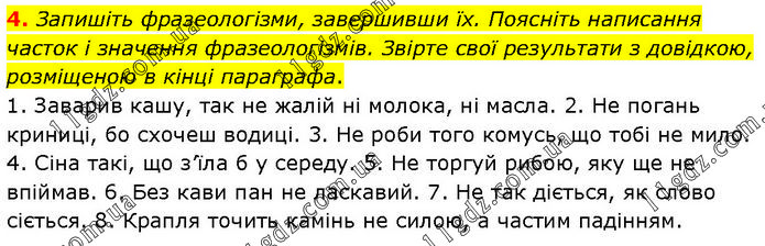 Запишіть фразеологізми, завершивши їх. Поясніть написання часток і значення фразеологізмів. Звірте свої результати з довідкою, розміщеною в кінці параграфа. 1. Заварив кашу, так не жалій ні молока, ні масла. 2. Не погань криниці, бо схочеш водиці. 3. Не роби того комусь, що тобі не мило. 4. Сіна такі, що з’їла б у середу. 5. Не торгуй рибою, яку ще не впіймав. 6. Без кави пан не ласкавий. 7. Не так діється, як слово сіється. 8. Крапля точить камінь не силою, а частим падінням.