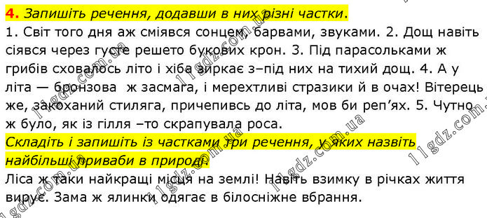 Запишіть речення, додавши в них різні частки. 1. Світ того дня аж сміявся сонцем, барвами, звуками. 2. Дощ навіть сіявся через густе решето букових крон. 3. Під парасольками ж грибів сховалось літо і хіба зиркає з–під них на тихий дощ. 4. А у літа — бронзова ж засмага, і мерехтливі стразики й в очах! Вітерець же, закоханий стиляга, причепивсь до літа, мов би реп’ях. 5. Чутно ж було, як із гілля –то скрапувала роса. Складіть і запишіть із частками три речення, у яких назвіть найбільші приваби в природі. Ліса ж таки найкращі місця на землі! Навіть взимку в річках життя вирує. Зама ж ялинки одягає в білосніжне вбрання.