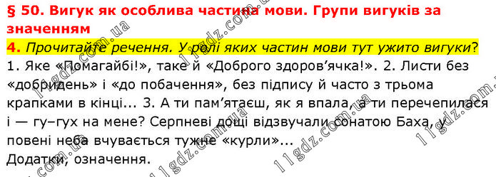 § 50. Вигук як особлива частина мови. Групи вигуків за значенням 4. Прочитайте речення. У ролі яких частин мови тут ужито вигуки? 1. Яке «Помагайбі!», таке й «Доброго здоров’ячка!». 2. Листи без «добридень» і «до побачення», без підпису й часто з трьома крапками в кінці... 3. А ти пам’ятаєш, як я впала, а ти перечепилася і — гу–гух на мене? Серпневі дощі відзвучали сонатою Баха, у повені неба вчувається тужне «курли»... Додатки, означення.
