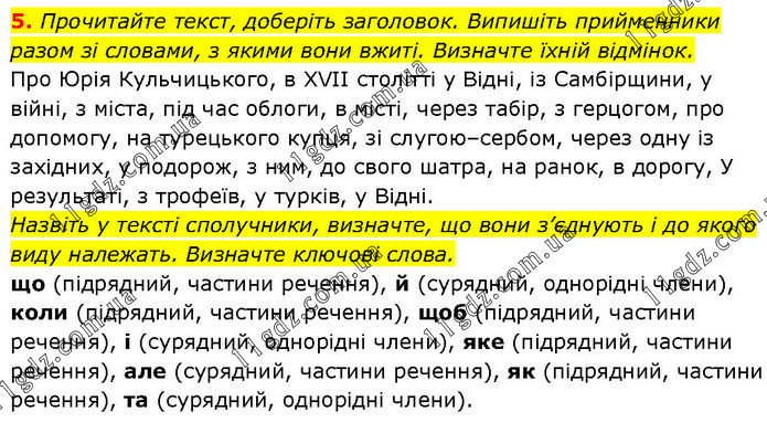 Прочитайте текст, доберіть заголовок. Випишіть прийменники разом зі словами, з якими вони вжиті. Визначте їхній відмінок. Про Юрія Кульчицького, в XVII столітті у Відні, із Самбірщини, у війні, з міста, під час облоги, в місті, через табір, з герцогом, про допомогу, на турецького купця, зі слугою–сербом, через одну із західних, у подорож, з ним, до свого шатра, на ранок, в дорогу, У результаті, з трофеїв, у турків, у Відні. Назвіть у тексті сполучники, визначте, що вони з’єднують і до якого виду належать. Визначте ключові слова. що (підрядний, частини речення), й (сурядний, однорідні члени), коли (підрядний, частини речення), щоб (підрядний, частини речення), і (сурядний, однорідні члени), яке (підрядний, частини речення), але (сурядний, частини речення), як (підрядний, частини речення), та (сурядний, однорідні члени).