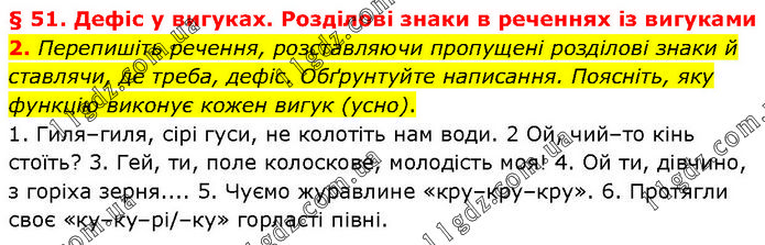 § 51. Дефіс у вигуках. Розділові знаки в реченнях із вигуками 2. Перепишіть речення, розставляючи пропущені розділові знаки й ставлячи, де треба, дефіс. Обґрунтуйте написання. Поясніть, яку функцію виконує кожен вигук (усно). 1. Гиля–гиля, сірі гуси, не колотіть нам води. 2 Ой, чий–то кінь стоїть? 3. Гей, ти, поле колоскове, молодість моя! 4. Ой ти, дівчино, з горіха зерня.... 5. Чуємо журавлине «кру–кру–кру». 6. Протягли своє «ку–ку–рі/–ку» горласті півні.