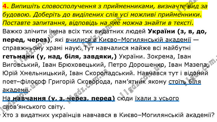 Випишіть словосполучення з прийменниками, визначте вид за будовою. Доберіть до виділених слів усі можливі прийменники. Поставте запитання, відповідь на яке можна знайти в тексті. Важко злічити імена всіх тих видатних людей України (з, в, до, перед, через), які вчилися в Києво–Могилянській академії — справжньому храмі наук. Тут навчалися майже всі майбутні гетьмани (у, над, біля, завдяки,) України. Зокрема, Іван Виговський, Іван Брюховецький, Петро Дорошенко, Іван Мазепа, Юрій Хмельницький, Іван Скоропадський. Навчався тут і відомий поет–філософ Григорій Сковорода, пам’ятник якому стоїть біля академії. На навчання (у, з, через, перед) сюди їхали з усього слов’янського світу. Хто з видатних українців навчався в Києво–Могилянській академії?