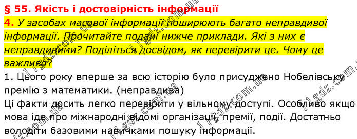 § 55. Якість і достовірність інформації 4. У засобах масової інформації поширюють багато неправдивої інформації. Прочитайте подані нижче приклади. Які з них є неправдивими? Поділіться досвідом, як перевірити це. Чому це важливо? 1. Цього року вперше за всю історію було присуджено Нобелівську премію з математики. (неправдива) Ці факти досить легко перевірити у вільному доступі. Особливо якщо мова іде про міжнародні відомі організації, премії, події. Достатньо володіти базовими навичками пошуку інформації.