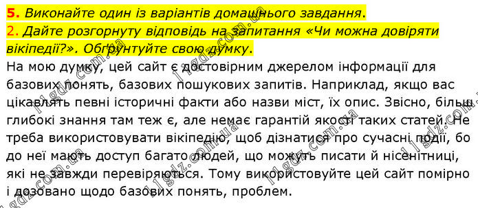 Виконайте один із варіантів домашнього завдання. 2. Дайте розгорнуту відповідь на запитання «Чи можна довіряти вікіпедії?». Обґрунтуйте свою думку. На мою думку, цей сайт є достовірним джерелом інформації для базових понять, базових пошукових запитів. Наприклад, якщо вас цікавлять певні історичні факти або назви міст, їх опис. Звісно, більш глибокі знання там теж є, але немає гарантій якості таких статей. Не треба використовувати вікіпедію, щоб дізнатися про сучасні події, бо до неї мають доступ багато людей, що можуть писати й нісенітниці, які не завжди перевіряються. Тому використовуйте цей сайт помірно і дозовано щодо базових понять, проблем.