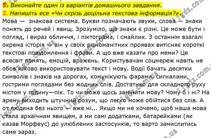 Виконайте один із варіантів домашнього завдання. 3. Напишіть есе «Чи скрізь доцільна текстова інформація?». Мова — знакова система. Букви позначають звуки, слова — знаки понять до речей і явищ. Зрозуміло, що знаки є різні. Це може бути і погляд, і вираз обличчя, і піктограма, і смайлик. З останнім взагалі окрема історія — він у своїх різноманітних проявах витісняє короткі текстові повідомлення і фрази. А що вже казати про меми? Це всесвіт понять, емоцій, вражень. Користувачам соцмереж навіть не обов’язково використовувати текст і мову. Водії бачать десятки символів і знаків на дорогах, комунікують фарами, сигналами, гострими поглядами без жодних слів. Достатньо для складного руху містом у годину—пік. То чи може щось замінити мову? Чому б і ні? На арену виходить штучний розум, що легко може обійтися без слів. А от людина без нього — вже ні... Якщо ми не хочемо, щоб наша мова стала архаїчним явищем, а ми самі додатками, батарейками (як казав Морфеус) до улюблених застосунків, то варто замислитись саме зараз.