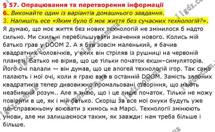 § 57. Опрацювання та перетворення інформації 6. Виконайте один із варіантів домашнього завдання. 3. Напишіть есе «Яким було б моє життя без сучасних технологій?». Я думаю, що моє життя без нових технологій не змінилося б надто сильно. Ми схильні перебільшувати значення нового. Колись мій батько грав у DOOM 2. А я був зовсім маленький, я бачив квадратних чоловічків, у яких він стріляв із рушниці на червоній планеті. Батько не вірив, що це тільки початок екшн–симуляторів. Його очі палали — він думав, що це апогей технологій ігор. Так само палають і мої очі, коли я граю вже в останній DOOM. Замість злобних квадратиків тепер дивовижно промальовані створіння, що мають неабиякий розум.. Але я знаю, що і це лише початок. Тільки не можу повірити в це, як і мій батько. Скоріш за все мої онуки будуть уже по–справжньому воювати з кимось на Марсі. Технології змінюють умови, але ми залишаємося таким, як завжди: нам треба більше і більше.