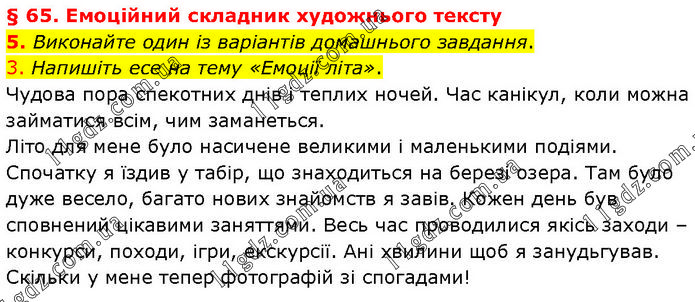 § 65. Емоційний складник художнього тексту 5. Виконайте один із варіантів домашнього завдання. 3. Напишіть есе на тему «Емоції літа». Чудова пора спекотних днів і теплих ночей. Час канікул, коли можна займатися всім, чим заманеться. Літо для мене було насичене великими і маленькими подіями. Спочатку я їздив у табір, що знаходиться на березі озера. Там було дуже весело, багато нових знайомств я завів. Кожен день був сповнений цікавими заняттями. Весь час проводилися якісь заходи –конкурси, походи, ігри, екскурсії. Ані хвилини щоб я занудьгував. Скільки у мене тепер фотографій зі спогадами!