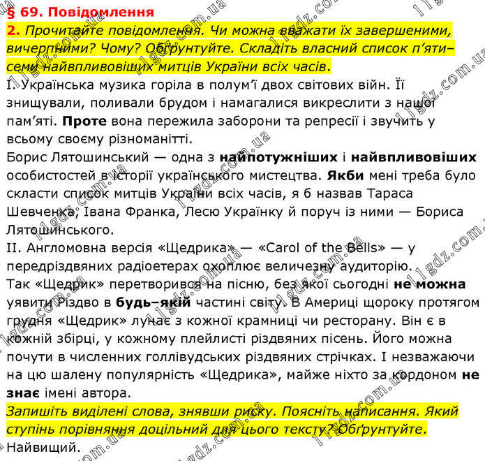 § 69. Повідомлення 2. Прочитайте повідомлення. Чи можна вважати їх завершеними, вичерпними? Чому? Обґрунтуйте. Складіть власний список п’яти–семи найвпливовіших митців України всіх часів. I. Українська музика горіла в полум’ї двох світових війн. Її знищували, поливали брудом і намагалися викреслити з нашої пам’яті. Проте вона пережила заборони та репресії і звучить у всьому своєму різноманітті. Борис Лятошинський — одна з найпотужніших і найвпливовіших особистостей в історії українського мистецтва. Якби мені треба було скласти список митців України всіх часів, я б назвав Тараса Шевченка, Івана Франка, Лесю Українку й поруч із ними — Бориса Лятошинського. II. Англомовна версія «Щедрика» — «Carol of the Bells» — у передріздвяних радіоетерах охоплює величезну аудиторію. Так «Щедрик» перетворився на пісню, без якої сьогодні не можна уявити Різдво в будь–якій частині світу. В Америці щороку протягом грудня «Щедрик» лунає з кожної крамниці чи ресторану. Він є в кожній збірці, у кожному плейлисті різдвяних пісень. Його можна почути в численних голлівудських різдвяних стрічках. І незважаючи на цю шалену популярність «Щедрика», майже ніхто за кордоном не знає імені автора. Запишіть виділені слова, знявши риску. Поясніть написання. Який ступінь порівняння доцільний для цього тексту? Обґрунтуйте. Найвищий.