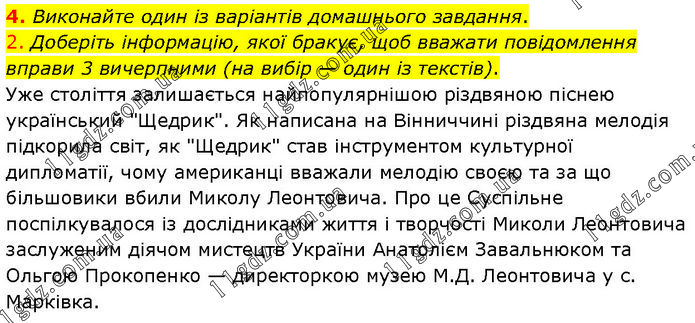 Виконайте один із варіантів домашнього завдання. 2. Доберіть інформацію, якої бракує, щоб вважати повідомлення вправи 3 вичерпними (на вибір — один із текстів). Уже століття залишається найпопулярнішою різдвяною піснею український "Щедрик". Як написана на Вінниччині різдвяна мелодія підкорила світ, як "Щедрик" став інструментом культурної дипломатії, чому американці вважали мелодію своєю та за що більшовики вбили Миколу Леонтовича. Про це Суспільне поспілкувалося із дослідниками життя і творчості Миколи Леонтовича заслуженим діячом мистецтв України Анатолієм Завальнюком та Ольгою Прокопенко — директоркою музею М.Д. Леонтовича у с. Марківка.