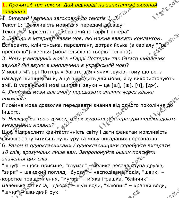 Прочитай три тексти. Дай відповіді на запитання і виконай завдання. 1. Вигадай і запиши заголовки до текстів 1, 3. Текст 1: "Важливість мови для передачі досвіду" Текст 3: "Парселтанг – мова змій із Гаррі Поттера" 2. Знайди в інтернеті назви мов, які можна вважати конлангом. Есперанто, клінгонська, парселтанг, дотракійська (з серіалу "Гра престолів"), квенья (мова ельфів із творів Толкіна). 3. Чому у вигаданій мові з «Гаррі Поттера» так багато шиплячих звуків? Які звуки є шиплячими в українській мові? У мові з «Гаррі Поттера» багато шиплячих звуків, тому що вона нагадує шипіння змій, а це підходить для мови, яку використовують змії. В українській мові шиплячі звуки – це [ш], [ж], [ч], [дж]. 4. Який вид мови дає змогу передавати знання через кілька поколінь? Писемна мова дозволяє передавати знання від одного покоління до іншого. 5. Навіщо, на твою думку, твори художньої літератури перекладають вигаданими мовами? Щоб підкреслити фантастичність світу і дати фанатам можливість глибше зануритися в культуру та мову вигаданих персонажів. 6. Разом із однокласниками / однокласницями спробуйте вигадати 10 слів, зрозумілих лише вам. Запропонуйте іншим пояснити значення цих слів. "шнуф" – щось приємне, "глумзя" – велика весела група друзів, "зирк" – швидкий погляд, "бурзя" – несподівана подія, "швик" – коротке повідомлення, "мумка" – м'яка іграшка, "блінчик" – маленька записка, "дзюрк" – шум води, "хлюпик" – крапля води, "шмиг" – швидкий рух