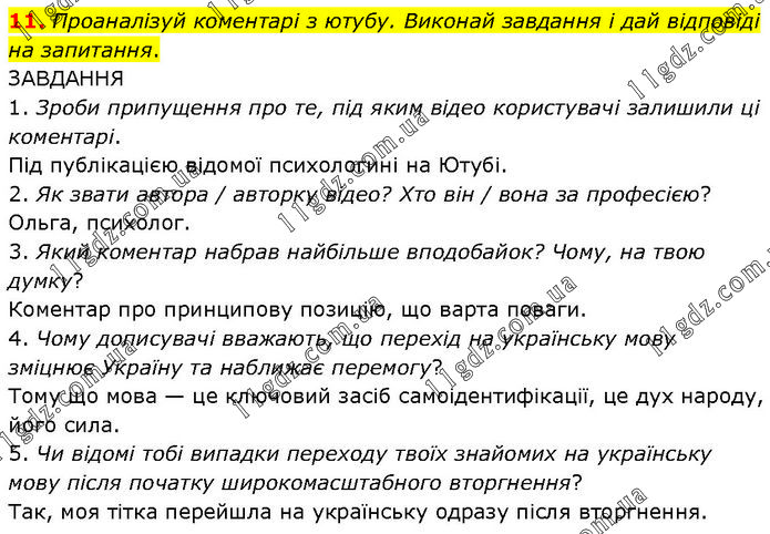 Проаналізуй коментарі з ютубу. Виконай завдання і дай відповіді на запитання. ЗАВДАННЯ 1. Зроби припущення про те, під яким відео користувачі залишили ці коментарі. Під публікацією відомої психологині на Ютубі. 2. Як звати автора / авторку відео? Хто він / вона за професією? Ольга, психолог. 3. Який коментар набрав найбільше вподобайок? Чому, на твою думку? Коментар про принципову позицію, що варта поваги. 4. Чому дописувачі вважають, що перехід на українську мову зміцнює Україну та наближає перемогу? Тому що мова — це ключовий засіб самоідентифікації, це дух народу, його сила. 5. Чи відомі тобі випадки переходу твоїх знайомих на українську мову після початку широкомасштабного вторгнення? Так, моя тітка перейшла на українську одразу після вторгнення.
