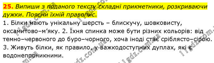 Випиши з поданого тексту складні прикметники, розкриваючи дужки. Поясни їхній правопис. 1. Білки мають унікальну шерсть – блискучу, шовковисту, оксамитово–м’яку. 2. Їхня спинка може бути різних кольорів: від темно–червоного до буро–чорного, хоча іноді стає сріблясто–сірою. 3. Живуть білки, як правило, у важкодоступних дуплах, які є водонепроникними.