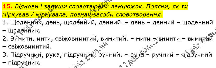 Віднови і запиши словотвірний ланцюжок. Поясни, як ти міркував / міркувала, познач засоби словотворення. 1. Щоденник, день, щоденний, денний. – день – денний – щоденний – щоденник. 2. Вимити, мити, свіжовимитий, вимитий. – мити – вимити – вимитий – свіжовимитий. 3. Підручний, рука, підручник, ручний. – рука – ручний – підручний – підручник.