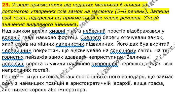 Утвори прикметники від поданих іменників й опиши за допомогою утворених слів замок на малюнку (5–6 речень). Запиши свій текст, підкресли всі прикметники як члени речення. З'ясуй значення виділеного іменника. Над замком висіли хмарні тіні, а небесний простір відображався у водяній гладі навколо фортеці. Скелясті береги оточували замок, який стояв на міцних каменистих підвалинах. Його дах був вкритий черепичним покриттям, що відсвічувало на сонячному світлі. На тлі гористих пейзажів замок здавався неприступним. Величезні дерев'яні ворота служили надійною охоронною перешкодою для всіх непроханих гостей. Герцог – титул високопоставленого шляхетного володаря, що займає одну з найвищих позицій в аристократичній ієрархії, вище графа, але нижче короля або імператора.