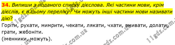 Випиши з поданого списку дієслова. Які частини мови, крім дієслів, є в цьому переліку? Чи можуть інші частини мови називати дію? Горіти, рухати, мимрити, чекати, лякати, чхати, вмивати, долати, грати, жебоніти. (іменники, можуть).