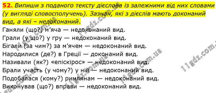 Випиши з поданого тексту дієслова із залежними від них словами (у вигляді словосполучень). Зазнач, які з дієслів мають доконаний вид, а які – недоконаний. Ганяли (що?) м’яча — недоконаний вид. Грали (у що?) у гру — недоконаний вид. Бігали (за чим?) за м’ячем — недоконаний вид. Народилися (де?) в Греції — доконаний вид. Називали (як?) «епіскірос» — недоконаний вид. Брали участь (у чому?) у ній — недоконаний вид. Подобалася (кому?) римлянам — недоконаний вид. Виконував (що?) вправи — недоконаний вид.