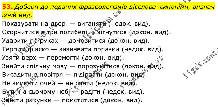 Добери до поданих фразеологізмів дієслова–синоніми, визнач їхній вид. Показувати на двері — виганяти (недок. вид). Скорчитися в три погибелі — зігнутися (докон. вид). Ударити по руках — домовитися (докон. вид). Терпіти фіаско — зазнавати поразки (недок. вид). Узяти верх — перемогти (докон. вид). Знайти спільну мову — порозумітися (докон. вид). Висадити в повітря — підірвати (докон. вид). Не змикати очей — не спати (недок. вид). Бути на сьомому небі — радіти (недок. вид). Звести рахунки — помститися (докон. вид).