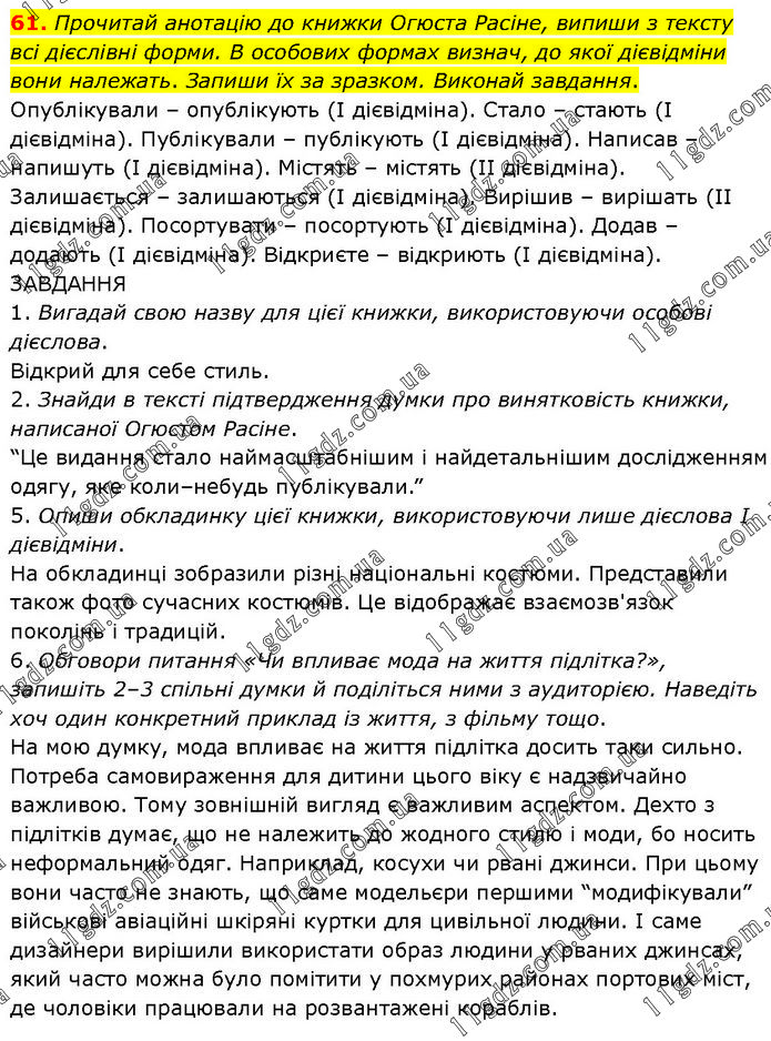 Прочитай анотацію до книжки Огюста Расіне, випиши з тексту всі дієслівні форми. В особових формах визнач, до якої дієвідміни вони належать. Запиши їх за зразком. Виконай завдання. Опублікували – опублікують (І дієвідміна). Стало – стають (І дієвідміна). Публікували – публікують (І дієвідміна). Написав – напишуть (І дієвідміна). Містять – містять (ІІ дієвідміна). Залишається – залишаються (І дієвідміна). Вирішив – вирішать (ІІ дієвідміна). Посортувати – посортують (І дієвідміна). Додав – додають (І дієвідміна). Відкриєте – відкриють (І дієвідміна). ЗАВДАННЯ 1. Вигадай свою назву для цієї книжки, використовуючи особові дієслова. Відкрий для себе стиль. 2. Знайди в тексті підтвердження думки про винятковість книжки, написаної Огюстом Расіне. “Це видання стало наймасштабнішим і найдетальнішим дослідженням одягу, яке коли–небудь публікували.” 5. Опиши обкладинку цієї книжки, використовуючи лише дієслова І дієвідміни. На обкладинці зобразили різні національні костюми. Представили також фото сучасних костюмів. Це відображає взаємозв'язок поколінь і традицій. 6. Обговори питання «Чи впливає мода на життя підлітка?», запишіть 2–3 спільні думки й поділіться ними з аудиторією. Наведіть хоч один конкретний приклад із життя, з фільму тощо. На мою думку, мода впливає на життя підлітка досить таки сильно. Потреба самовираження для дитини цього віку є надзвичайно важливою. Тому зовнішній вигляд є важливим аспектом. Дехто з підлітків думає, що не належить до жодного стилю і моди, бо носить неформальний одяг. Наприклад, косухи чи рвані джинси. При цьому вони часто не знають, що саме модельєри першими “модифікували” військові авіаційні шкіряні куртки для цивільної людини. І саме дизайнери вирішили використати образ людини у рваних джинсах, який часто можна було помітити у похмурих районах портових міст, де чоловіки працювали на розвантажені кораблів.