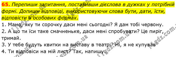 Перепиши запитання, поставивши дієслова в дужках у потрібній формі. Допиши відповіді, використовуючи слова бути, дати, їсти, відповісти в особових формах. 1. Мамо, яку ти сорочку даси мені сьогодні? Я дам тобі червону. 2. А що ти їси таке смачненьке, даси мені спробувати? Це пиріг, тримай. 3. У тебе будуть квитки на виставу в театрі? Ні, я не купував 4. Ти відповіси на мій лист? Так, напишу.