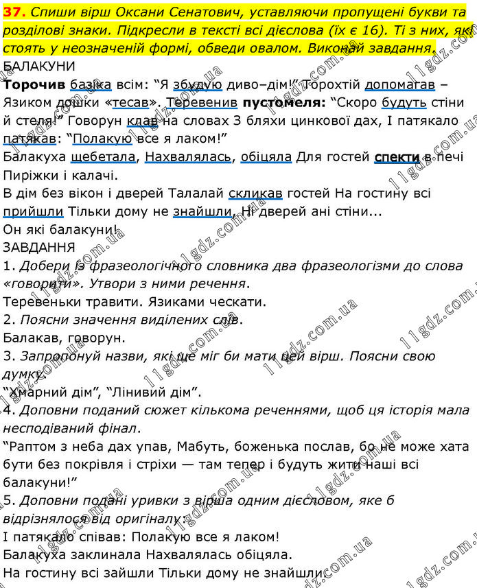 Спиши вірш Оксани Сенатович, уставляючи пропущені букви та розділові знаки. Підкресли в тексті всі дієслова (їх є 16). Ті з них, які стоять у неозначеній формі, обведи овалом. Виконай завдання. БАЛАКУНИ Торочив базіка всім: “Я збудую диво–дім!” Торохтій допомагав – Язиком дошки «тесав». Теревенив пустомеля: “Скоро будуть стіни й стеля!” Говорун клав на словах З бляхи цинкової дах, І патякало патякав: “Полакую все я лаком!” Балакуха щебетала, Нахвалялась, обіцяла Для гостей спекти в печі Пиріжки і калачі. В дім без вікон і дверей Талалай скликав гостей На гостину всі прийшли Тільки дому не знайшли, Ні дверей ані стіни... Он які балакуни! ЗАВДАННЯ 1. Добери із фразеологічного словника два фразеологізми до слова «говорити». Утвори з ними речення. Теревеньки травити. Язиками ческати. 2. Поясни значення виділених слів. Балакав, говорун. 3. Запропонуй назви, які ще міг би мати цей вірш. Поясни свою думку. “Хмарний дім”, “Лінивий дім”. 4. Доповни поданий сюжет кількома реченнями, щоб ця історія мала несподіваний фінал. “Раптом з неба дах упав, Мабуть, боженька послав, бо не може хата бути без покрівля і стріхи — там тепер і будуть жити наші всі балакуни!” 5. Доповни подані уривки з вірша одним дієсловом, яке б відрізнялося від оригіналу: І патякало співав: Полакую все я лаком! Балакуха заклинала Нахвалялась обіцяла. На гостину всі зайшли Тільки дому не знайшли.