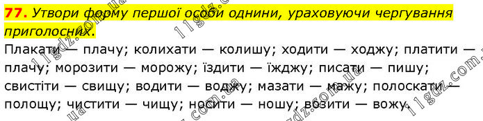 Утвори форму першої особи однини, ураховуючи чергування приголосних. Плакати — плачу; колихати — колишу; ходити — ходжу; платити — плачу; морозити — морожу; їздити — їжджу; писати — пишу; свистіти — свищу; водити — воджу; мазати — мажу; полоскати — полощу; чистити — чищу; носити — ношy; возити — вожу.