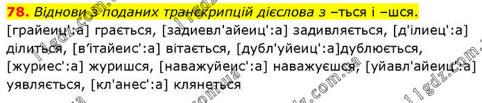 Віднови з поданих транскрипцій дієслова з –ться і –шся. [грайеиц':а] грається, [задиевл'айеиц':а] задивляється, [д'ілиец':а] ділиться, [в’ітайеис':а] вітається, [дубл'уйеиц':а]дублюється, [журиес':а] журишся, [наважуйеис':а] наважуєшся, [уйавл'айеиц':а] уявляється, [кл'анес':а] клянеться