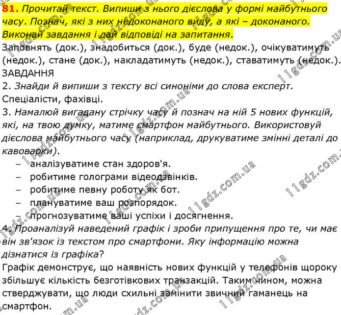 Прочитай текст. Випиши з нього дієслова у формі майбутнього часу. Познач, які з них недоконаного виду, а які – доконаного. Виконай завдання і дай відповіді на запитання. Заповнять (док.), знадобиться (док.), буде (недок.), очікуватимуть (недок.), стане (док.), накладатимуть (недок.), ставатимуть (недок.). ЗАВДАННЯ 2. Знайди й випиши з тексту всі синоніми до слова експерт. Спеціалісти, фахівці. 3. Намалюй вигадану стрічку часу й познач на ній 5 нових функцій, які, на твою думку, матиме смартфон майбутнього. Використовуй дієслова майбутнього часу (наприклад, друкуватиме змінні деталі до кавоварки). – аналізуватиме стан здоров'я. – робитиме голограми відеодзвінків. – робитиме певну роботу як бот. – плануватиме ваш розпорядок. – прогнозуватиме ваші успіхи і досягнення. 4. Проаналізуй наведений графік і зроби припущення про те, чи має він зв'язок із текстом про смартфони. Яку інформацію можна дізнатися із графіка? Графік демонструє, що наявність нових функцій у телефонів щороку збільшує кількість безготівкових транзакцій. Таким чином, можна стверджувати, що люди схильні замінити звичний гаманець на смартфон.
