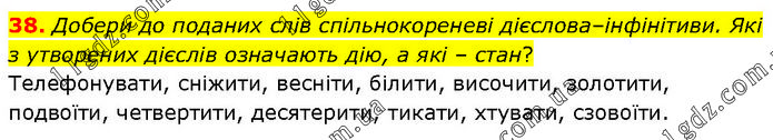 Добери до поданих слів спільнокореневі дієслова–інфінітиви. Які з утворених дієслів означають дію, а які – стан? Телефонувати, сніжити, весніти, білити, височити, золотити, подвоїти, четвертити, десятерити, тикати, хтувати, сзовоїти.