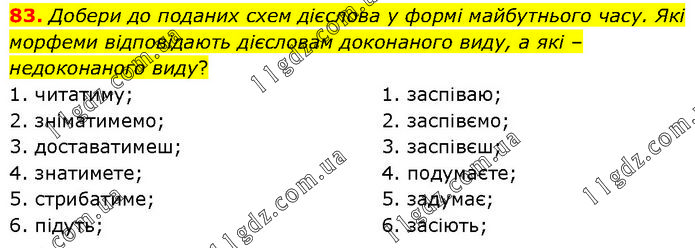 Добери до поданих схем дієслова у формі майбутнього часу. Які морфеми відповідають дієсловам доконаного виду, а які – недоконаного виду? 1. читатиму; 2. зніматимемо; 3. доставатимеш; 4. знатимете; 5. стрибатиме; 6. підуть; 1. заспіваю; 2. заспівємо; 3. заспівєш; 4. подумаєте; 5. задумає; 6. засіють;