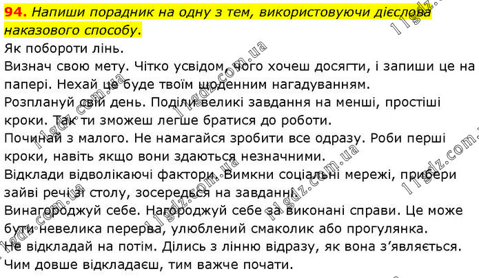 Напиши порадник на одну з тем, використовуючи дієслова наказового способу. Як побороти лінь. Визнач свою мету. Чітко усвідом, чого хочеш досягти, і запиши це на папері. Нехай це буде твоїм щоденним нагадуванням. Розплануй свій день. Поділи великі завдання на менші, простіші кроки. Так ти зможеш легше братися до роботи. Починай з малого. Не намагайся зробити все одразу. Роби перші кроки, навіть якщо вони здаються незначними. Відклади відволікаючі фактори. Вимкни соціальні мережі, прибери зайві речі зі столу, зосередься на завданні. Винагороджуй себе. Нагороджуй себе за виконані справи. Це може бути невелика перерва, улюблений смаколик або прогулянка. Не відкладай на потім. Ділись з лінню відразу, як вона з’являється. Чим довше відкладаєш, тим важче почати.