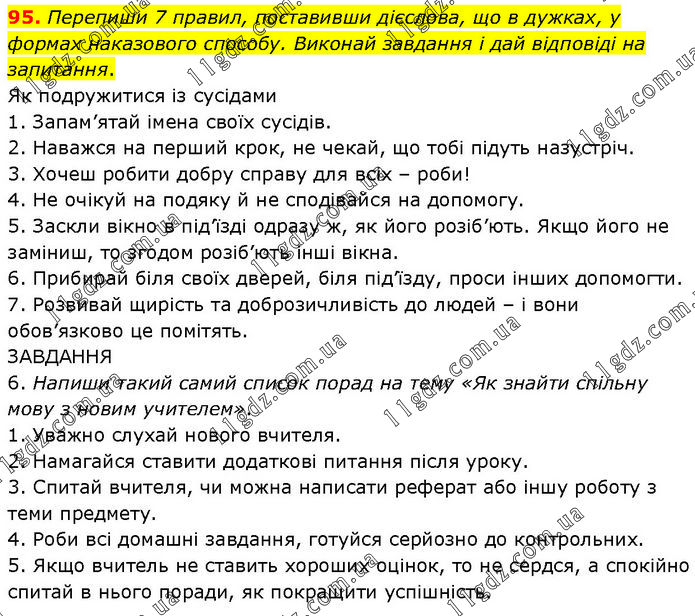 Перепиши 7 правил, поставивши дієслова, що в дужках, у формах наказового способу. Виконай завдання і дай відповіді на запитання. Як подружитися із сусідами 1. Запам’ятай імена своїх сусідів. 2. Наважся на перший крок, не чекай, що тобі підуть назустріч. 3. Хочеш робити добру справу для всіх – роби! 4. Не очікуй на подяку й не сподівайся на допомогу. 5. Заскли вікно в під’їзді одразу ж, як його розіб’ють. Якщо його не заміниш, то згодом розіб’ють інші вікна. 6. Прибирай біля своїх дверей, біля під’їзду, проси інших допомогти. 7. Розвивай щирість та доброзичливість до людей – і вони обов’язково це помітять. ЗАВДАННЯ 6. Напиши такий самий список порад на тему «Як знайти спільну мову з новим учителем». 1. Уважно слухай нового вчителя. 2. Намагайся ставити додаткові питання після уроку. 3. Спитай вчителя, чи можна написати реферат або іншу роботу з теми предмету. 4. Роби всі домашні завдання, готуйся серйозно до контрольних. 5. Якщо вчитель не ставить хороших оцінок, то не сердся, а спокійно спитай в нього поради, як покращити успішність.