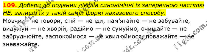 109. Добери до поданих дієслів синонімічні із заперечною часткою НЕ, запиши їх у такій самій формі наказового способу. Мовчи — не говори, стій — не іди, пам’ятайте — не забувайте, видужуй — не хворій, радіймо — не сумуймо, очищайте — не забруднюйте, заспокоймося — не хвилюймося, поважайте — не зневажайте.