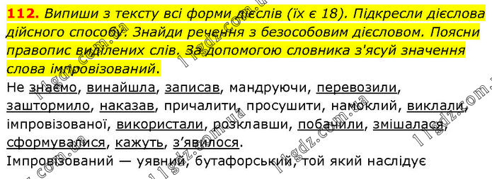 112. Випиши з тексту всі форми дієслів (їх є 18). Підкресли дієслова дійсного способу. Знайди речення з безособовим дієсловом. Поясни правопис виділених слів. За допомогою словника з'ясуй значення слова імпровізований. Не знаємо, винайшла, записав, мандруючи, перевозили, заштормило, наказав, причалити, просушити, намоклий, виклали, імпровізованої, використали, розклавши, побачили, змішалася, сформувалися, кажуть, з’явилося. Імпровізований — уявний, бутафорський, той який наслідує.
